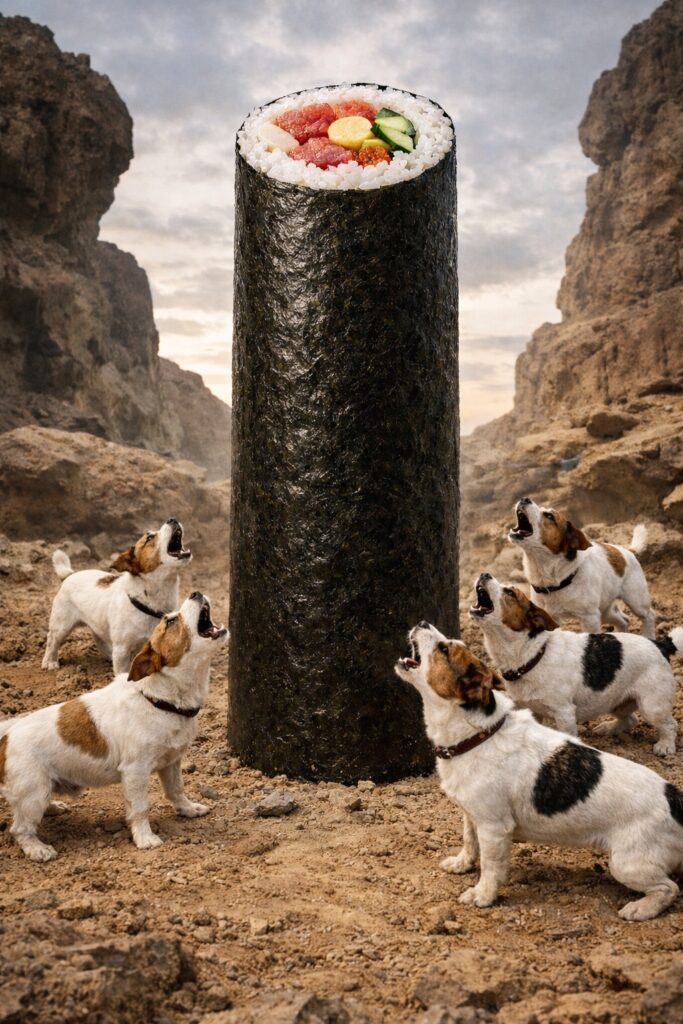 私たちが太巻きを食べる間ずっと足元でワンワン!と吠えていたものでした